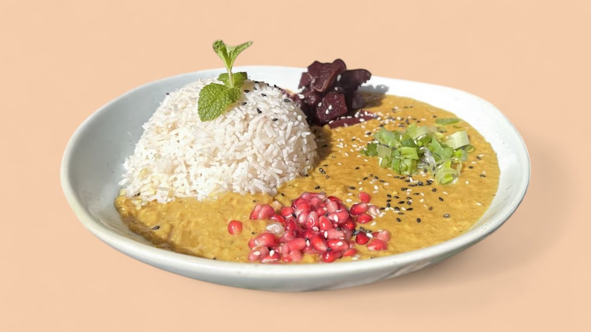 Basmati Reis mit Curry aus roten Linsen, Kokosmilch, hauseigener Curry-Kurkuma-Mischung, Curry-Bllättern, Tomaten, roter Bete, Granatapfel, Kokosraspeln und Lauchzwiebeln