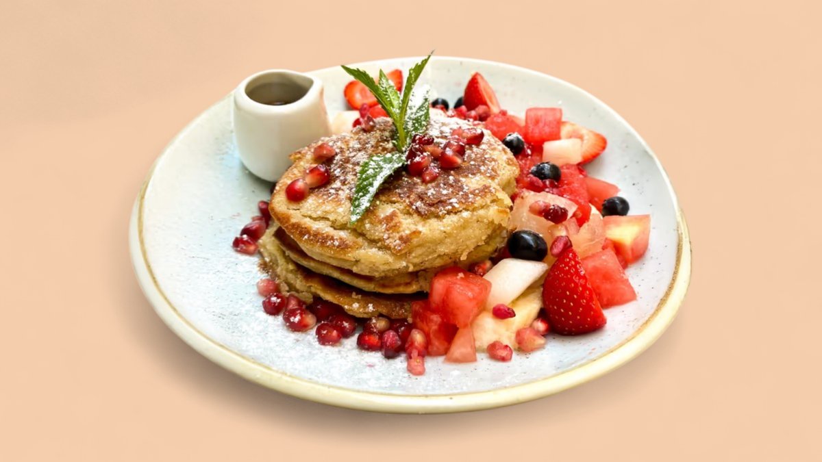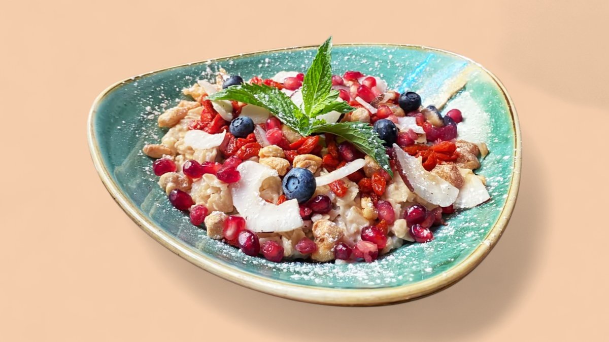 Haferflocken, Banane, Granatapfel, frische Früchte, Cashew-Crunch, Minze und Ahornsirup