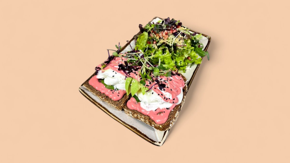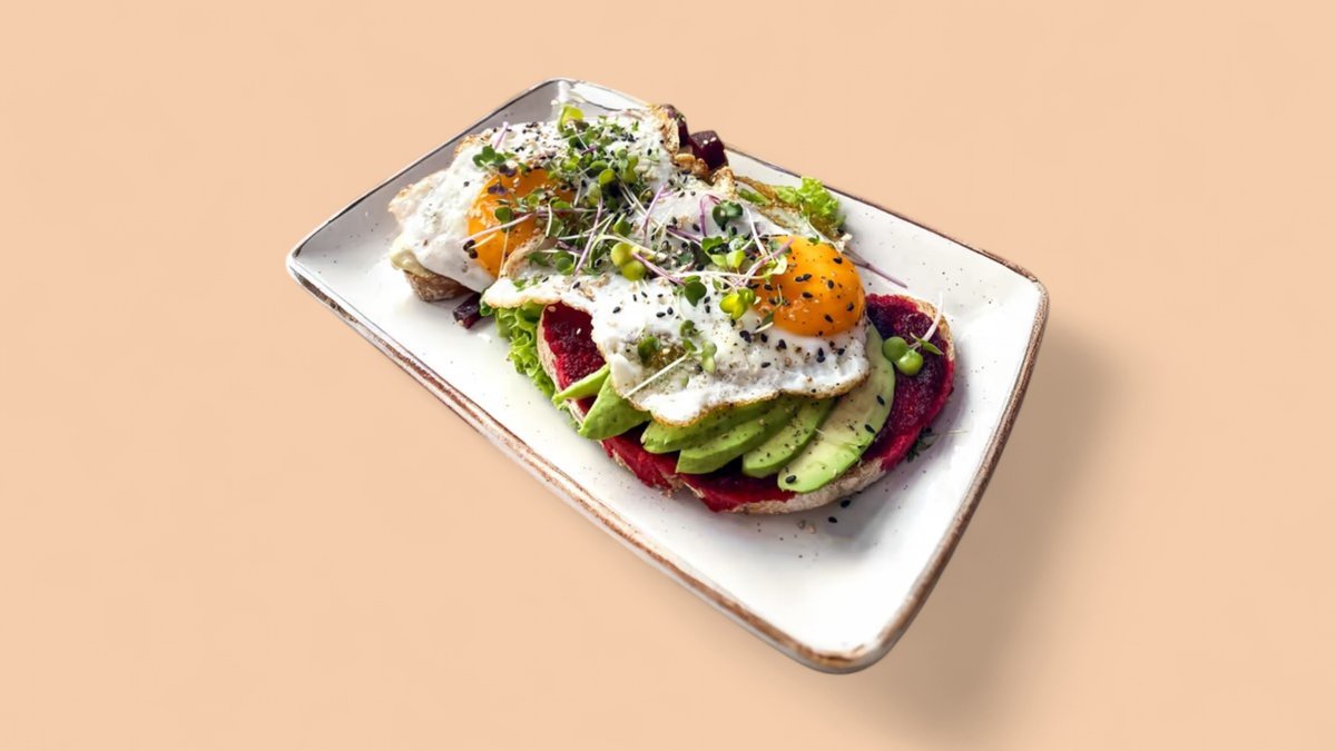 getoastetes Roggenvollkornbrot, 2 Spiegeleier, frischer Avocado, Avocado-Mayo, rote Bete und Hummus