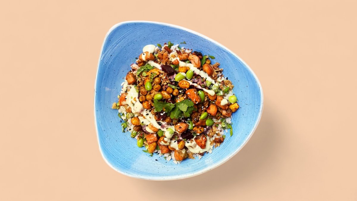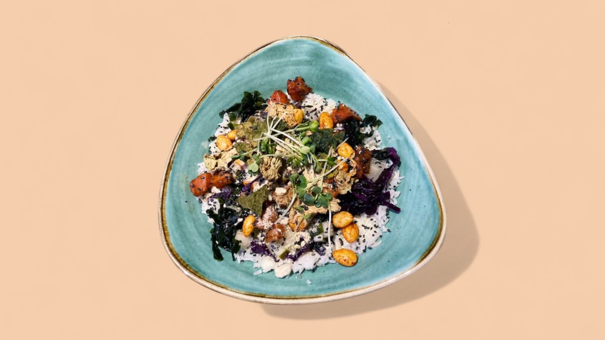 kalter Kokosreis mit Edamame, Melonen, roter Bete, Fish oder Veggie, Granatapfel, Röstzwiebel, Kichererbsen, Koriander, Sumak und Rote-Betesoße