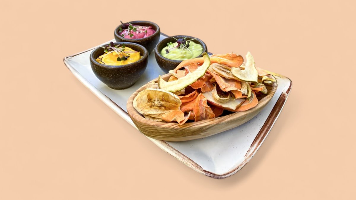 getrocknete Apfel, Birnen, Bananen und Karottenstücke mit drei Dips, Hummus, Rote-Bete-Mayo und Avocado-Tomaten-Mayo