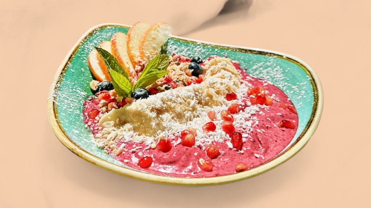 dunkle Beeren, frische Früchte, Cashew-Crunch, Kokosflocken, Minze und Wanderlust-Granola