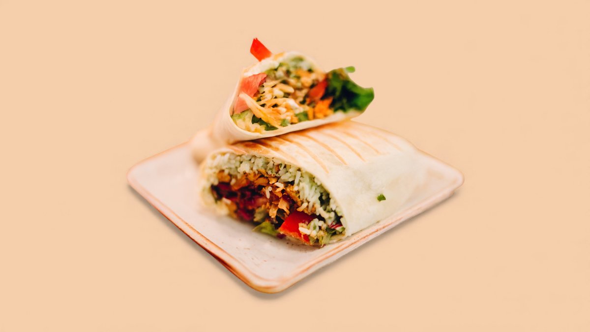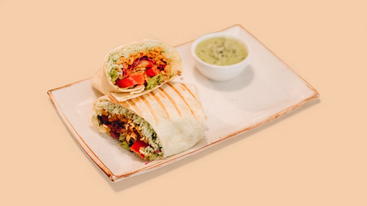 Wrap mit vegan pulled BBQ von Planted, Reis, Salat, Blaukraut, Koriander-Limettensoße, Tomaten, Röstzwiebeln und Sumak