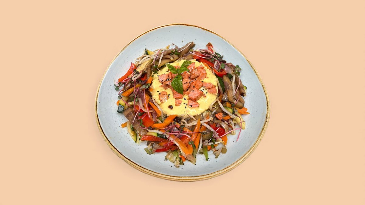 Wokgericht mit Basmatireis, gegrillten Karotten, Zucchini, Aubergine, Paprika, rote Zwiebeln und Soja-Sprossen; mit gegrilltem Lachs oder geräuchertem Tofu, als Hauptbestandteil eine peruanische helle Aji-Soße, getoppt mit Granatapfel.