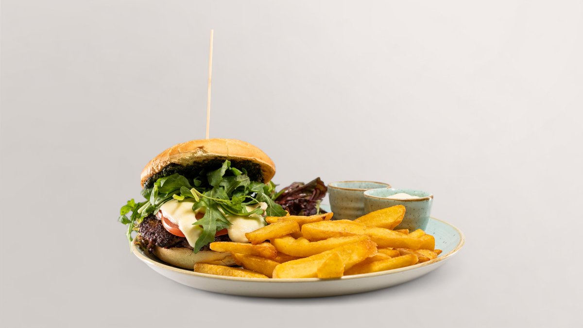 mit 100 % Angus Rind, Pesto, Mozzarella, Tomaten und Rucola. Dazu gibt es Fritten mit Mayonnaise und Ketchup.