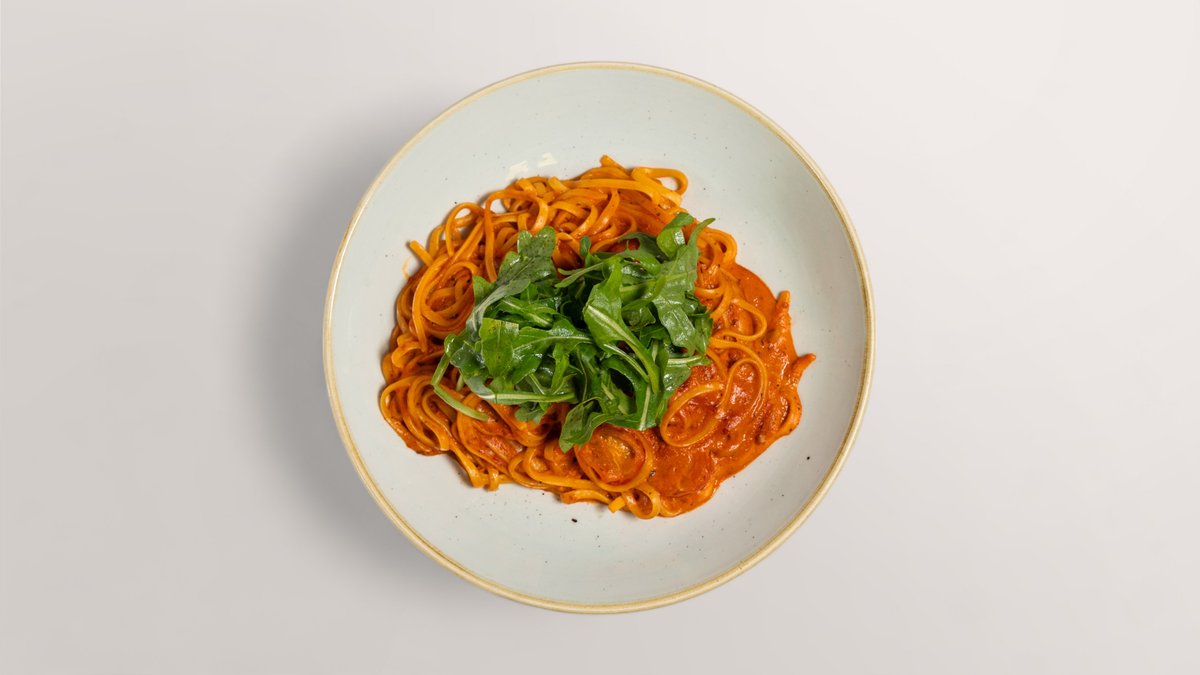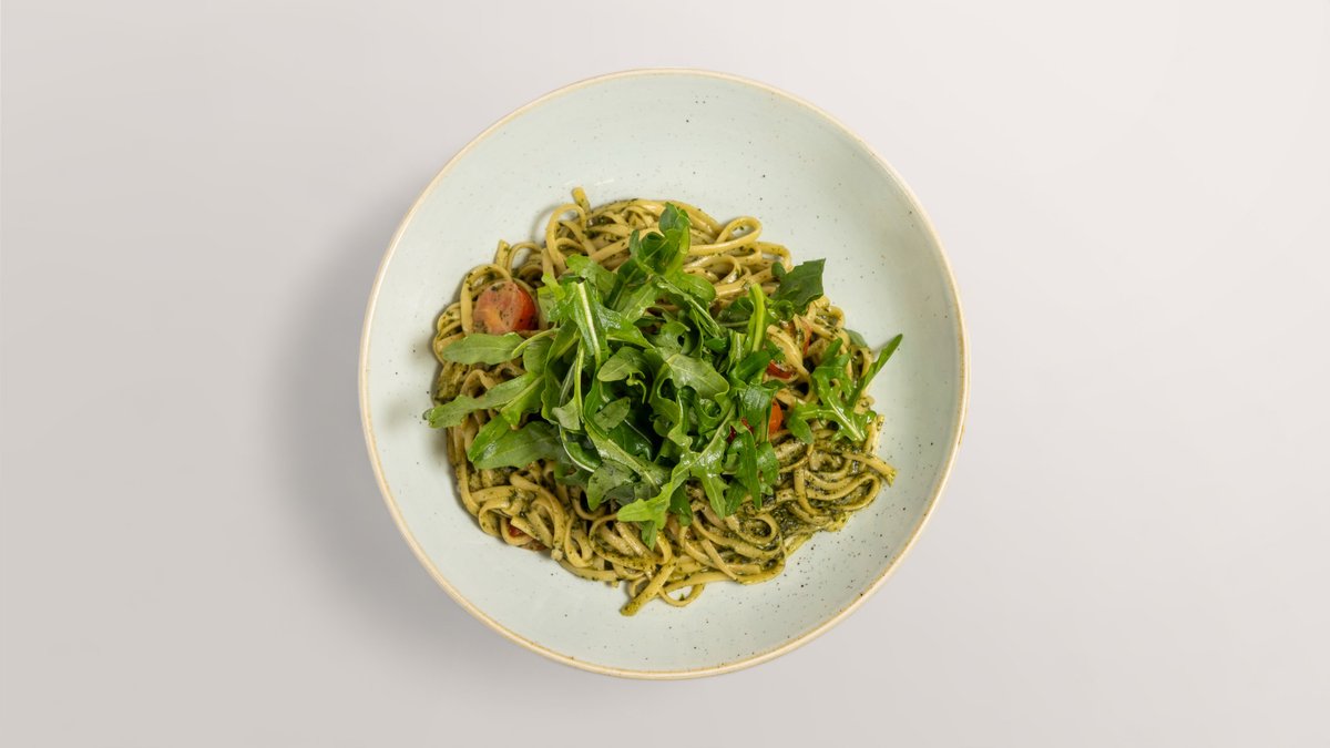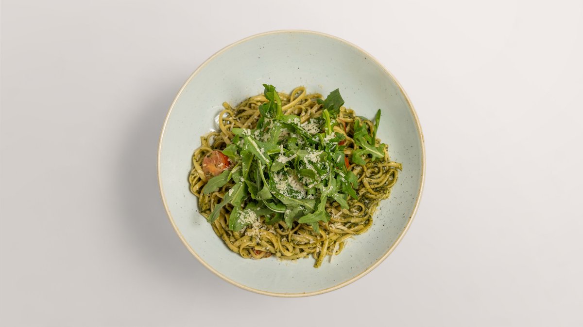 mit Linguine, Basilikumpesto, Kirschtomaten, Rucola und Grana Padano