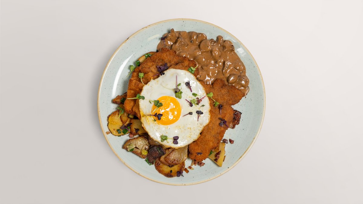 mit Champignon-Pfeffersoße, Spiegelei, Grünzeug und Bratkartoffeln