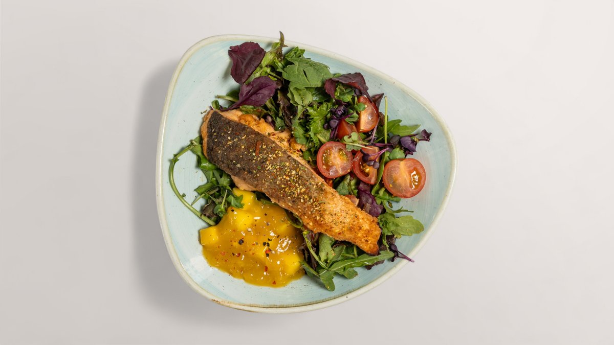 mit gebratenem Lachsfilet, Mizuna, Mangold, Römersalat, Mango und Limetten-Chili-Vinaigrette