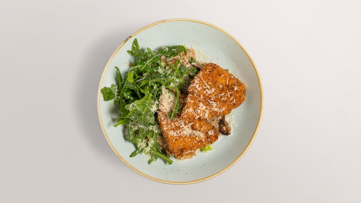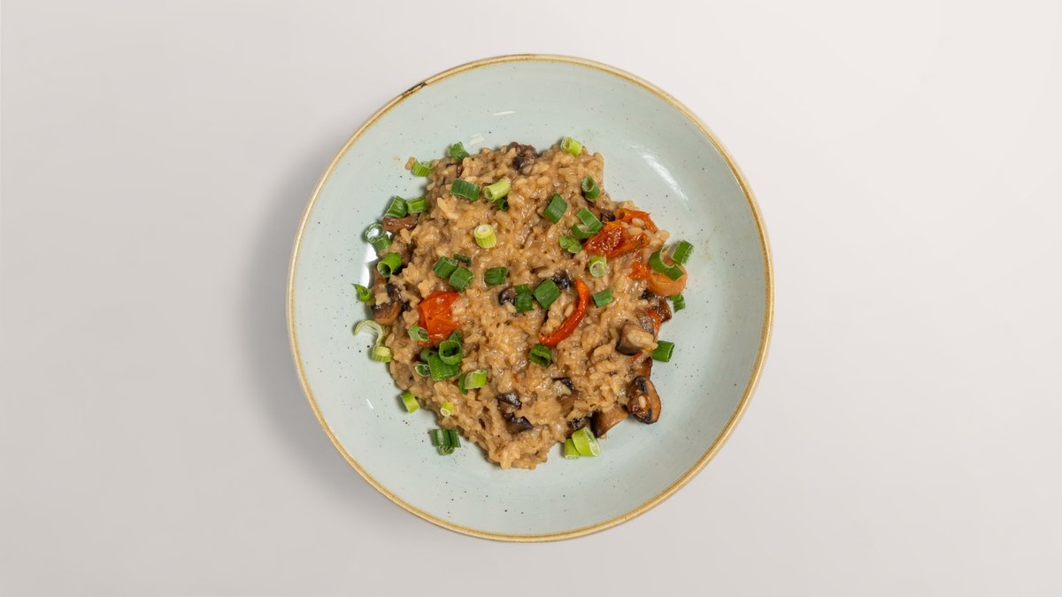 mit zwei Sorten Pilzrisotto, getrockneten Tomaten und Rucola