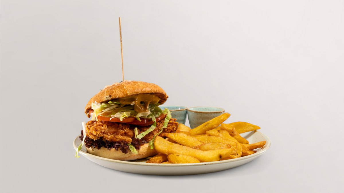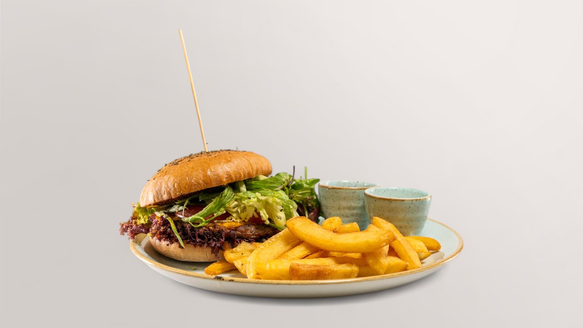 mit 100 % Angus Rind, Gurken-Dill-Relish, gebratenen Zwiebeln, Cheddar und bunter Salat. Dazu gibt es Fritten mit Mayonnaise und Ketchup.
