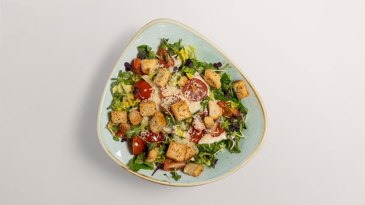 mit Croutons, Kirschtomaten, Grana Padano und Salatherzen