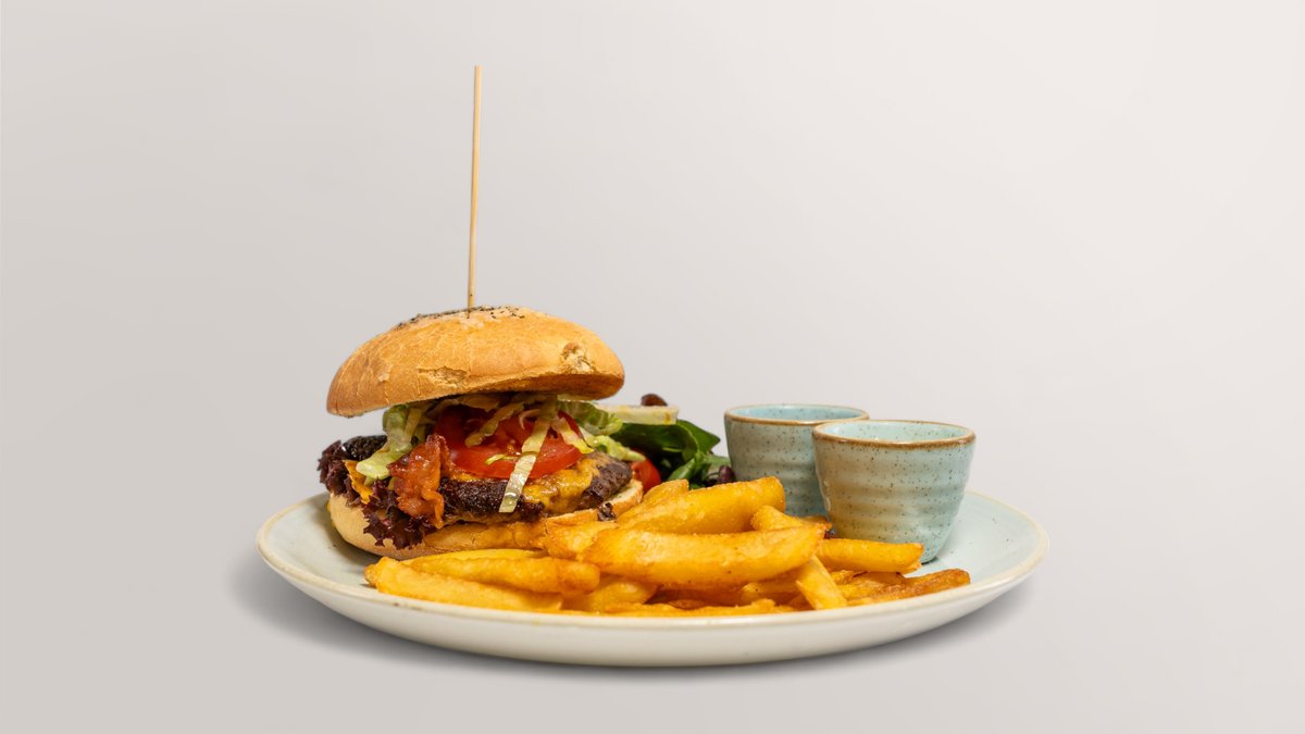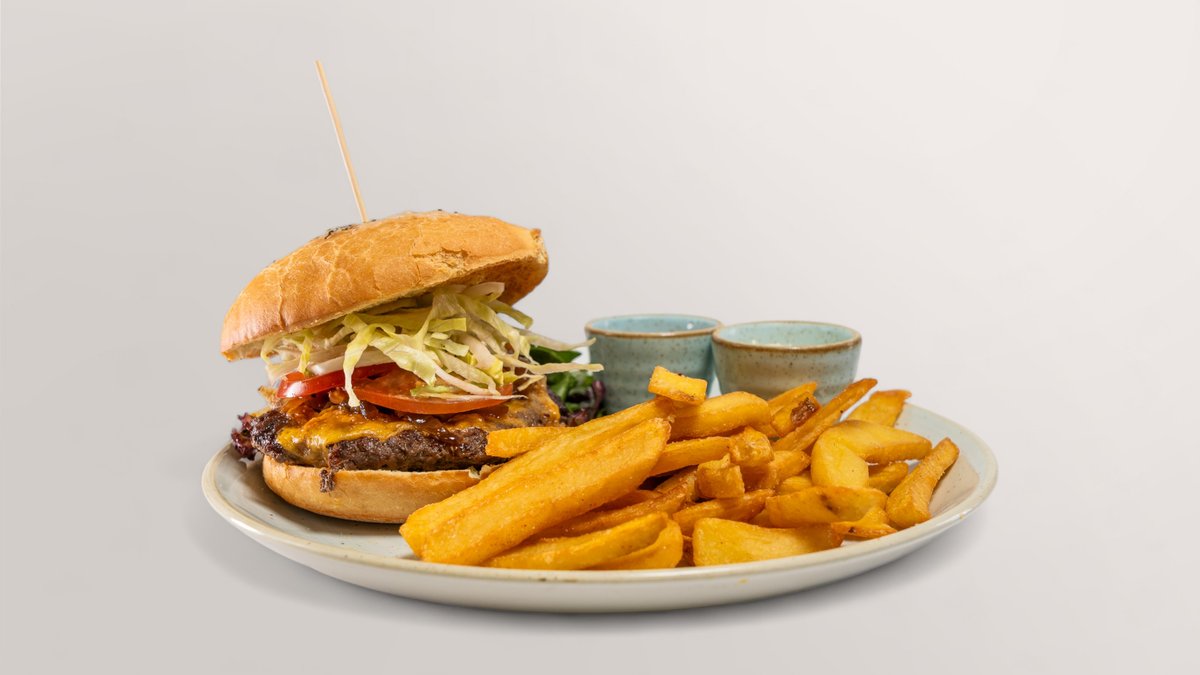 mit 100 % Angus-Rindfleisch, Barbecue-Whiskysoße, Cheddar, Speck und buntem Salat. Dazu gibt es Fritten mit Mayonnaise und Ketchup. Enthält Alkohol, für Kinder und schwangere Frauen nicht geeignet