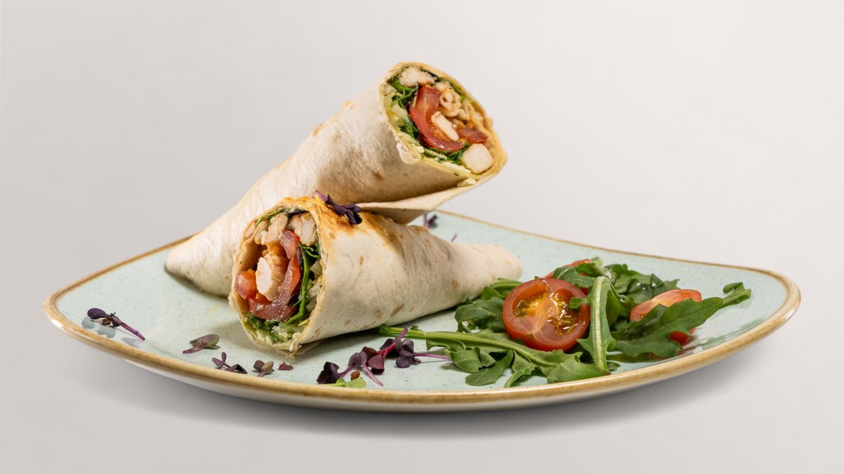 mit Hähnchen, Cornflakes-Mantel, Curry-Mayonnaise und buntem Salat. Dazu gibt es Fritten mit Mayonnaise und Ketchup.