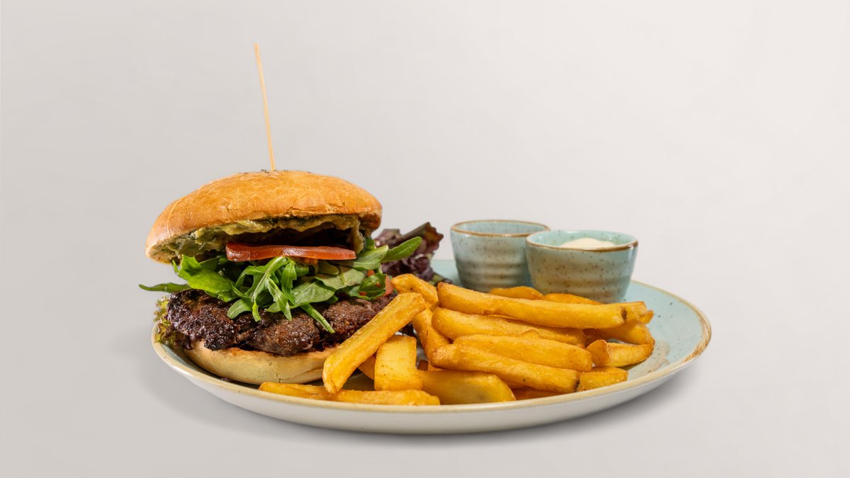 mit 100 % Angus Rind, Guacamole, karamellisierten Zwiebeln, Cheddar und buntem Salat. Dazu gibt es Fritten mit Mayonnaise und Ketchup.