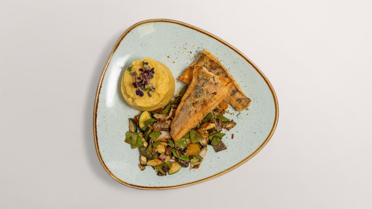 mit Zander auf der Haut, Kartoffelpüree und gebratenem Gemüse