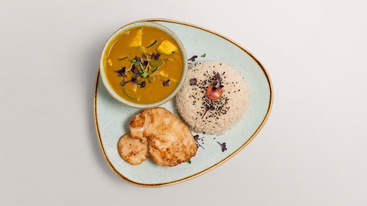 mit knackigem Gemüse, Koriander, Limetten, Kokosmilch und Reis