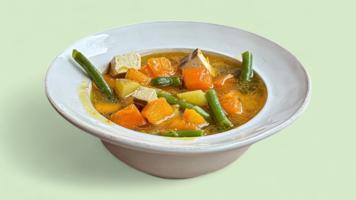 würzige Suppe mit Butternutkürbis, Tofu, Kartoffeln und grünen Bohnen