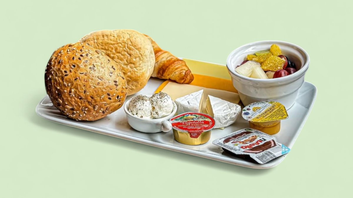 mit Körnerbrötchen, Weizenbrötchen, Gouda, Cheddar, Bergkäse, Camembert, veganem Brotaufstrich, Kräuterfrischkäse, Honig, Nutella und Obstsalat