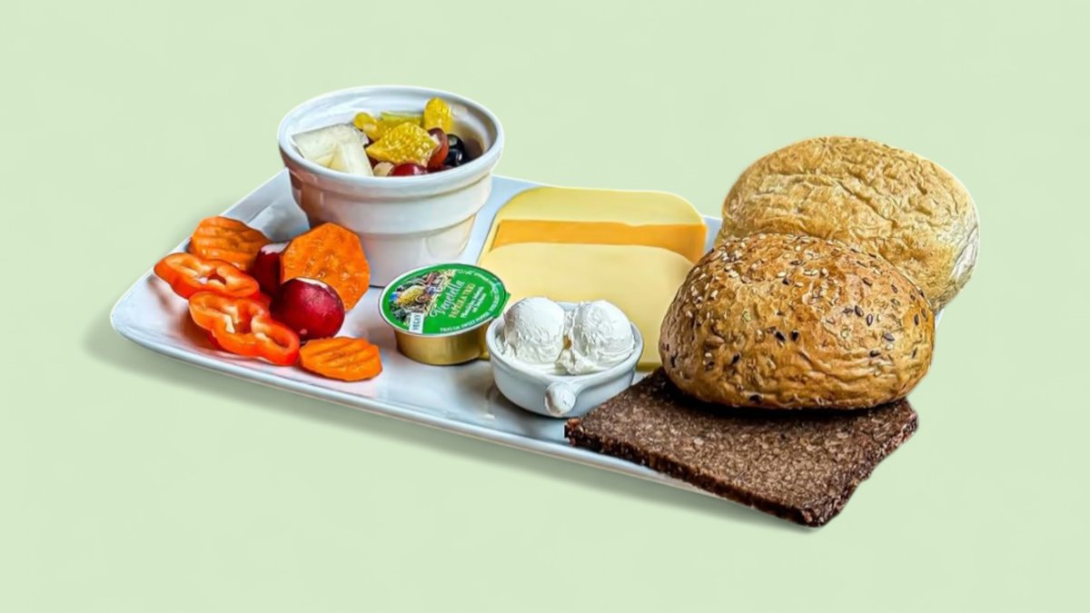 mit Körnerbrötchen, Weizenbrötchen, Pumpernickel, Rohkost-Trilogie, veganem Frischkäse (Gouda- & Cheddar-Geschmack), veganem Brotaufstrich und Obstsalat