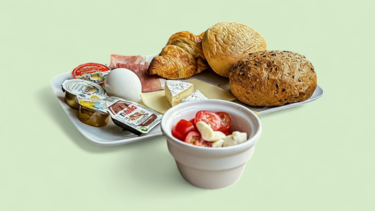 klassisches Frühstück mit Körnerbrötchen, Weizenbrötchen, Croissant, Schwarzwälder Schinken vom Schwein, Camembert, Gouda, Honig, Nutella, veganem Brotaufstrich, Geflügelaufstrich, Ei, Tomaten und Mozzarella
