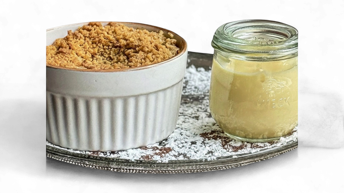 warme gebackene Äpfel mit Streuseln, serviert mit Vanillesoße