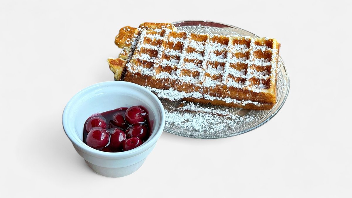 dicke belgische Waffel mit Puderzucker und heißen Kirschen