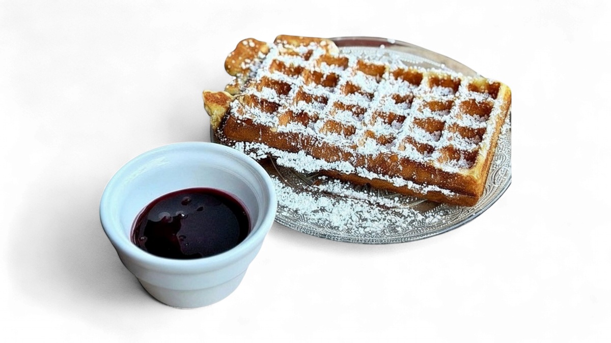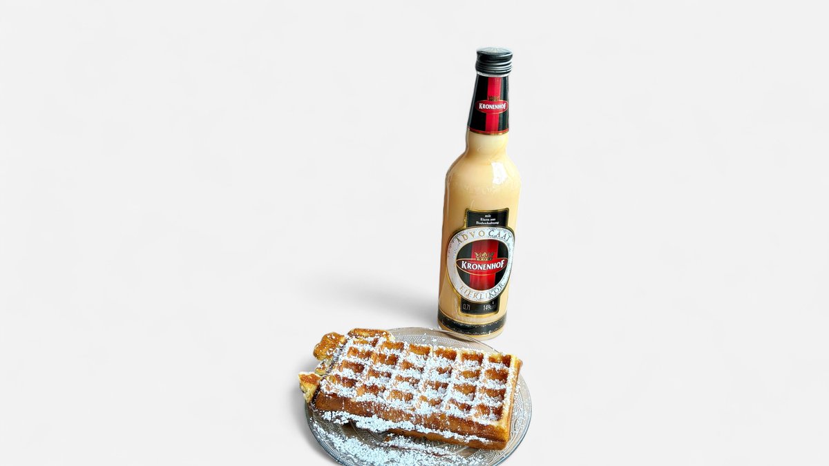 dicke belgische Waffel mit einer cremigen Soße, mit Eierlikör verfeinert Enthält Alkohol, für Kinder und schwangere Frauen nicht geeignet
