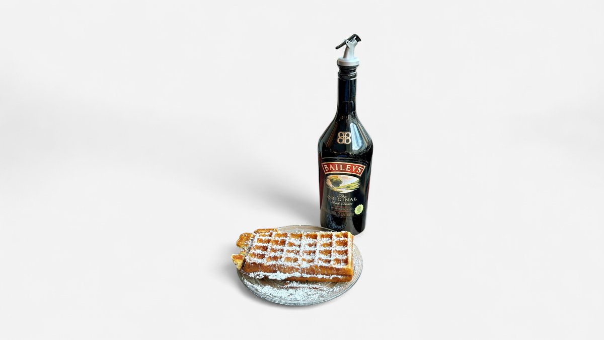 dicke belgische Waffel mit einer cremigen Soße, mit Baileys verfeinert Enthält Alkohol, für Kinder und schwangere Frauen nicht geeignet