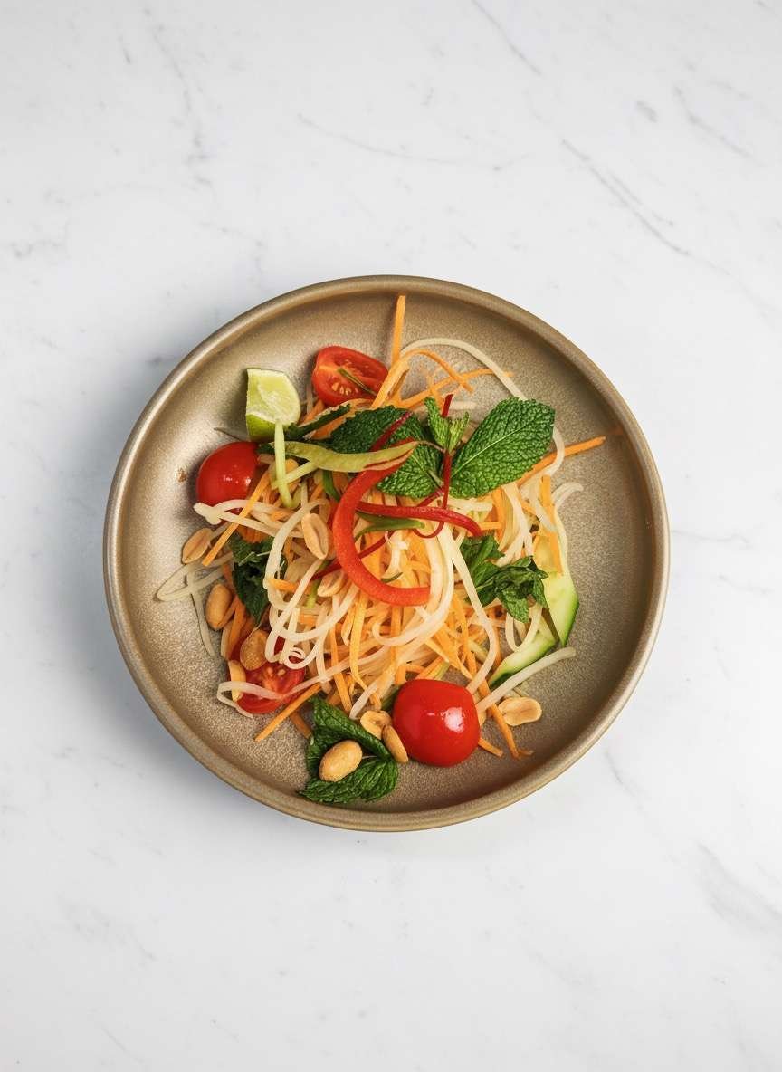 Grüne Papaya mit Chili, Koriander, Tomaten, Tamarinde, Erdnüsse, Fisch Soße
