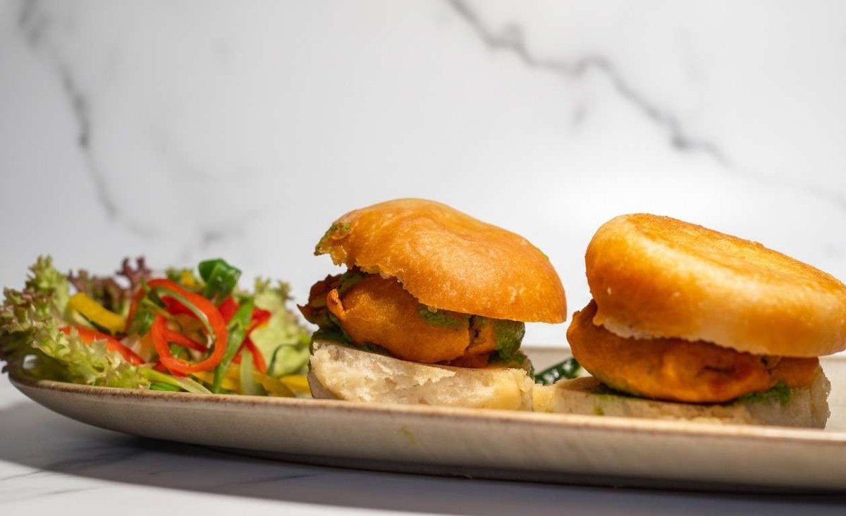 Hausgemachtes Brot gefüllt mit Kartoffelknödeln, die in Kichererbsenmehlteig frittiert, Zwiebeln und indischen Gewürzen