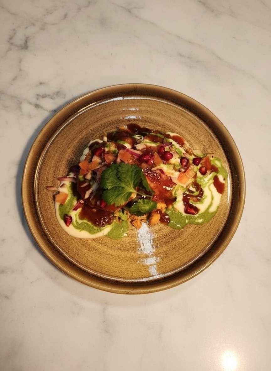 Würzig Kartoffel Patty mit Tomaten, Zwiebeln, Koriander serviert mit Joghurt und Tamarinde - Minze Soße