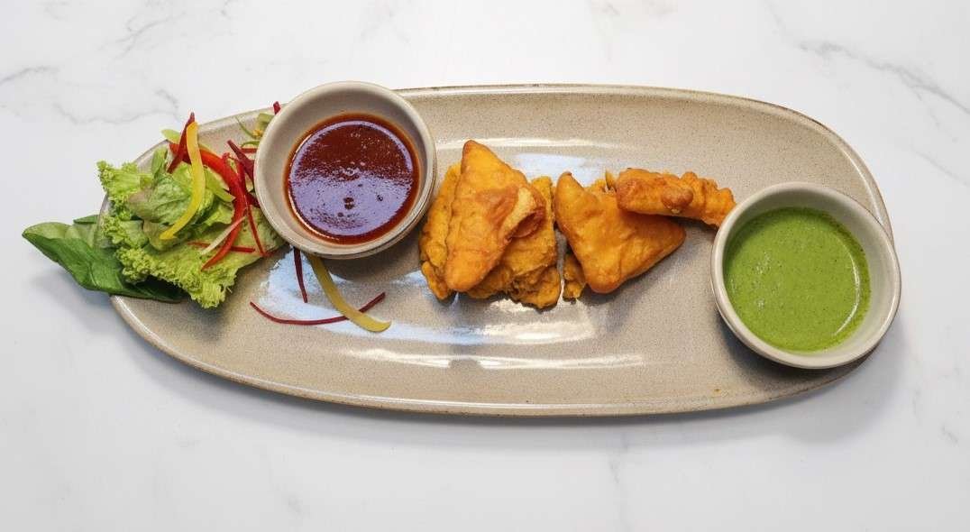 Frittierte Teigtaschen mit einer Füllung aus Kartoffeln, Cashewnüsse und Erbsen serviert mit Tamarinde Soße