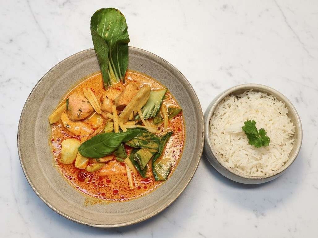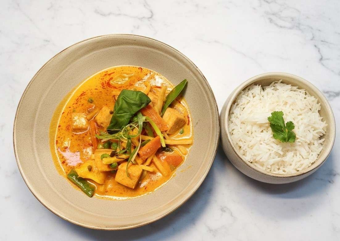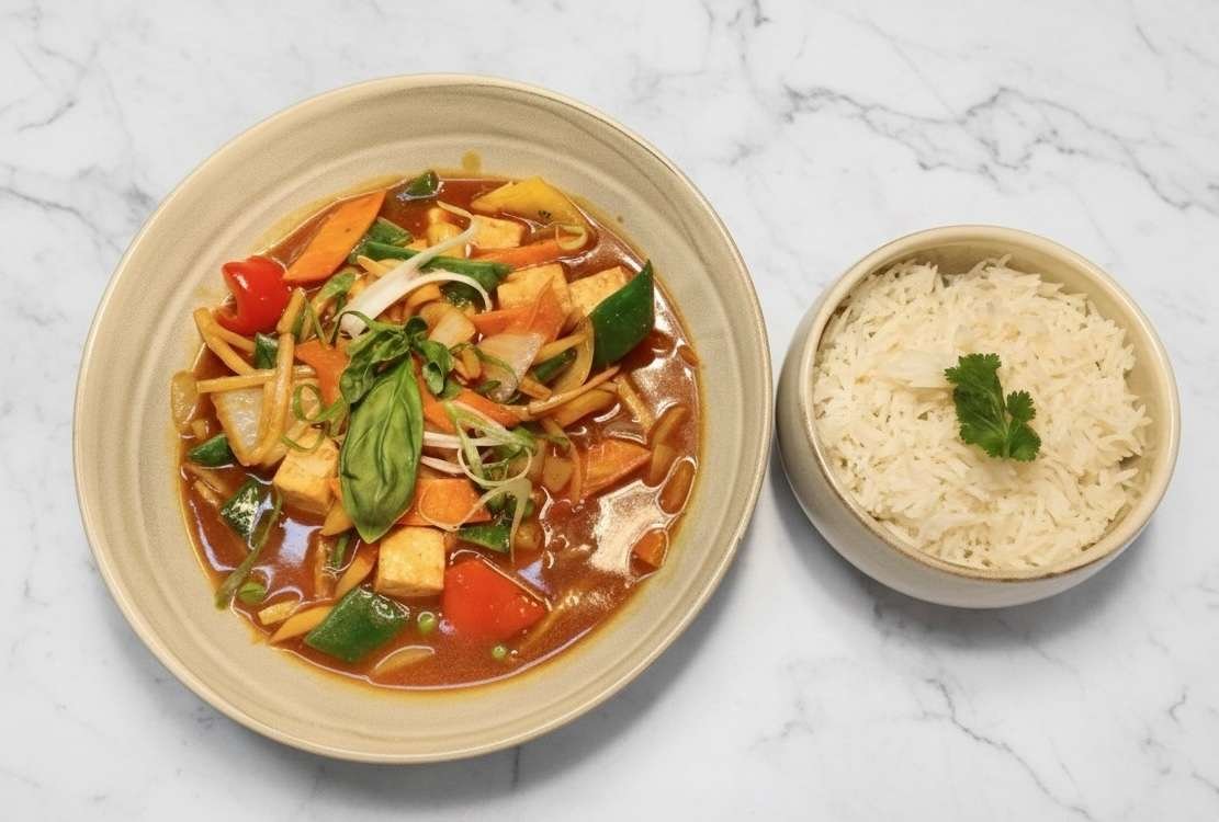 Tofu in grünem Curry mit Gemüse, Thai-Basilikum und Kokosmilch