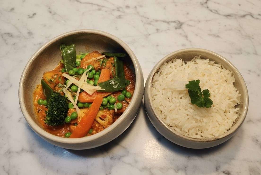 Tofu in einer Mango Soße, mit verschiedenem Gemüse, Basilikum und Mandeln serviert mit Basmatireis