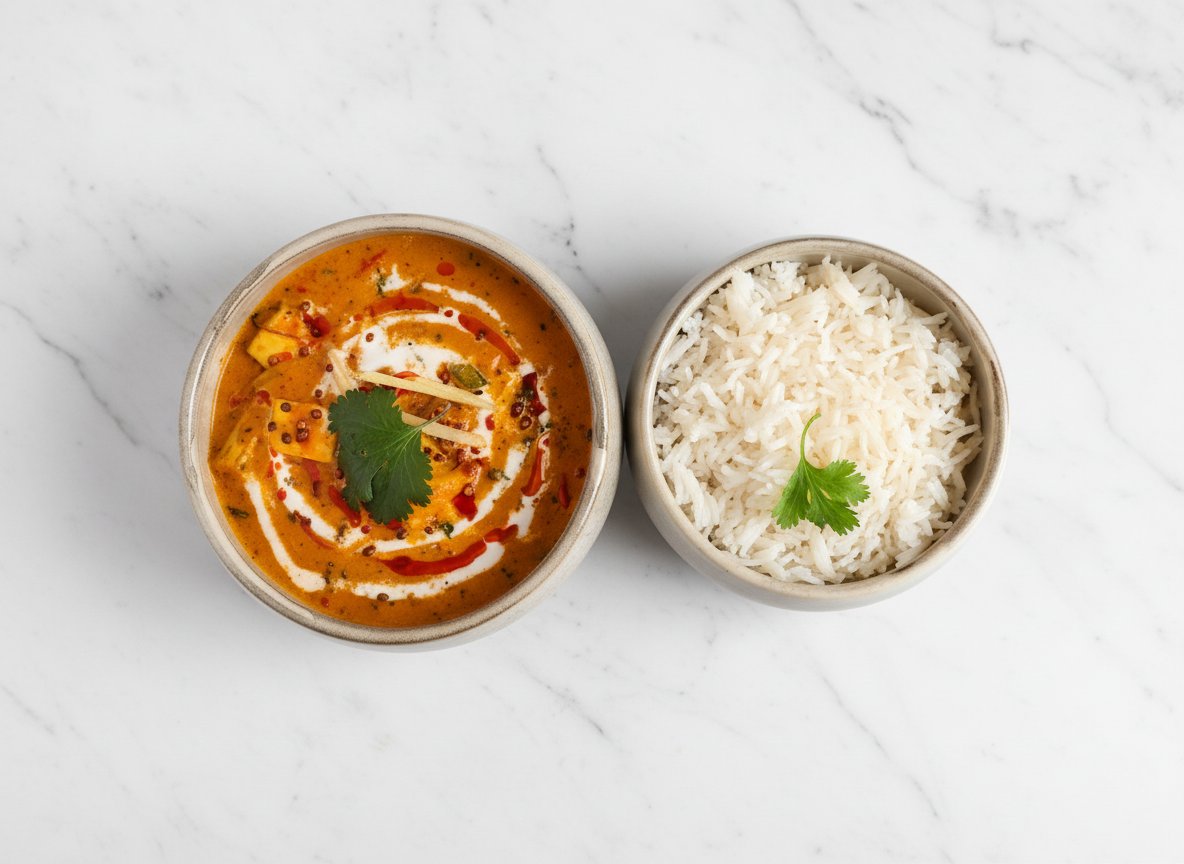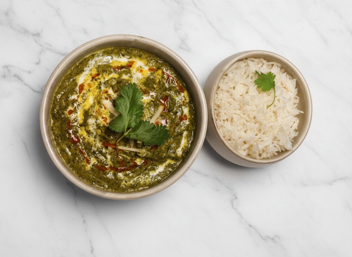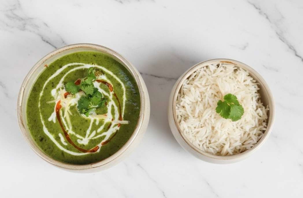 Hausgemachter Rahmkäse mit Spinat, Ingwer, Knoblauch in Masala Soße serviert mit Basmatireis
