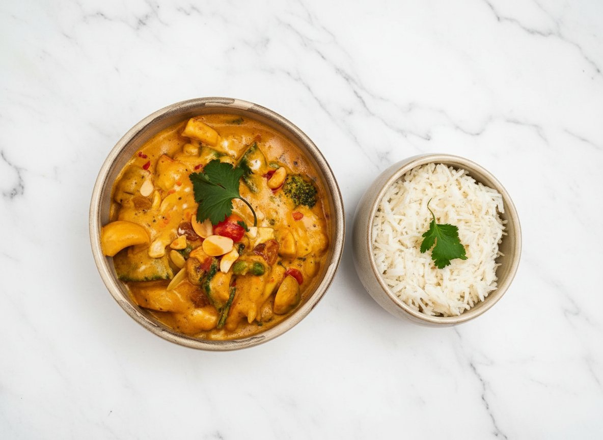 Zubereitetes Hähnchenbrustfilet in einer Nüsse- und Samenpasten Soße mit Kokosmilch