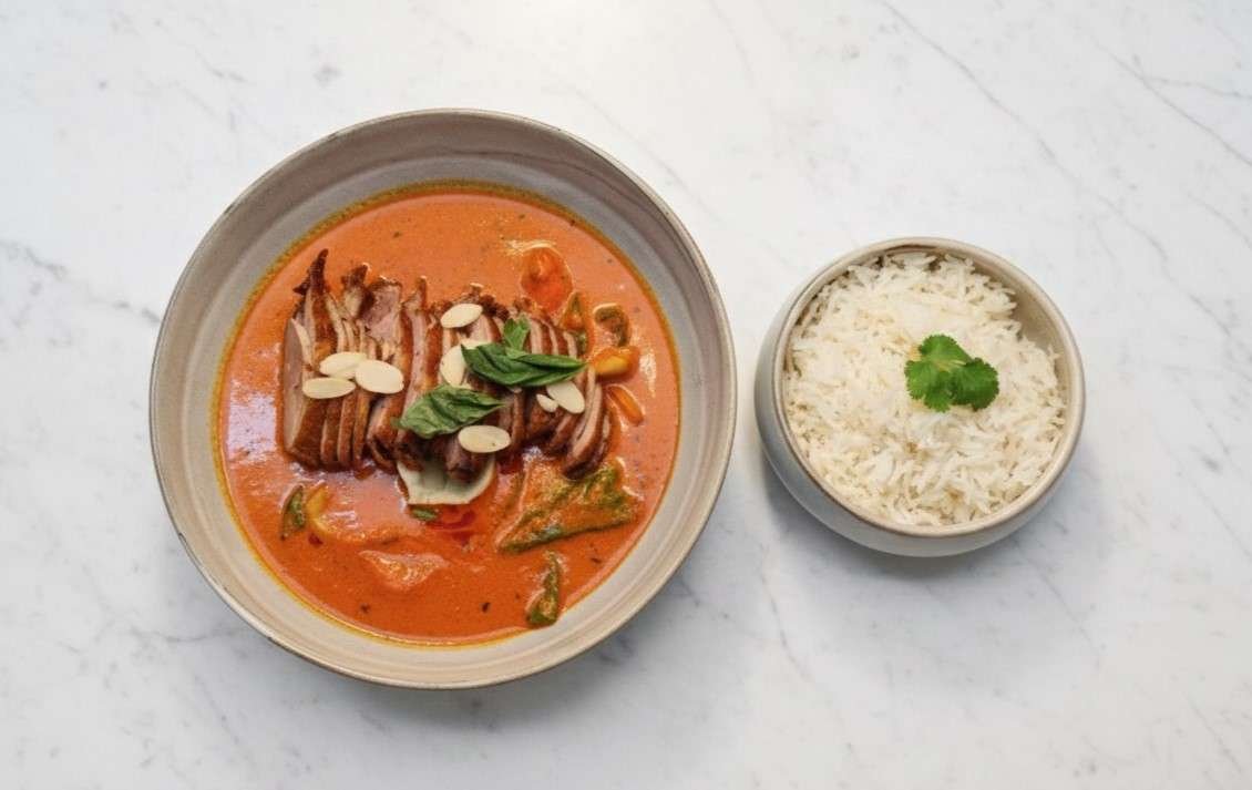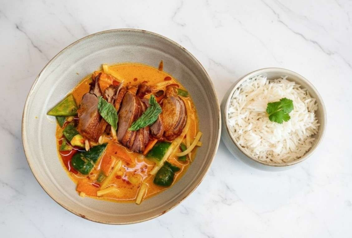 Knuspriges Entenfleisch mit Erdnuss Soße, Gemüse und Kokosmilch