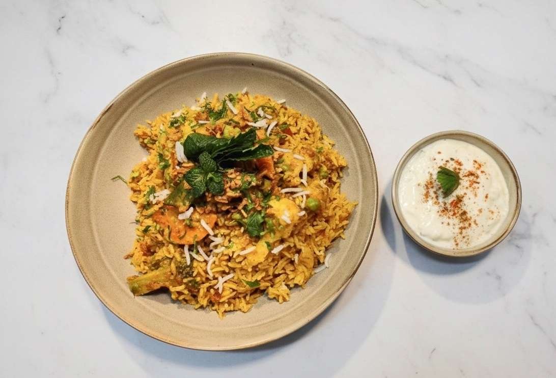 Die weltberühmte indische Reispfanne mit Gemüse, Rosinen, Nüssen, exotischen Gewürzen serviert mit Gurken Raita