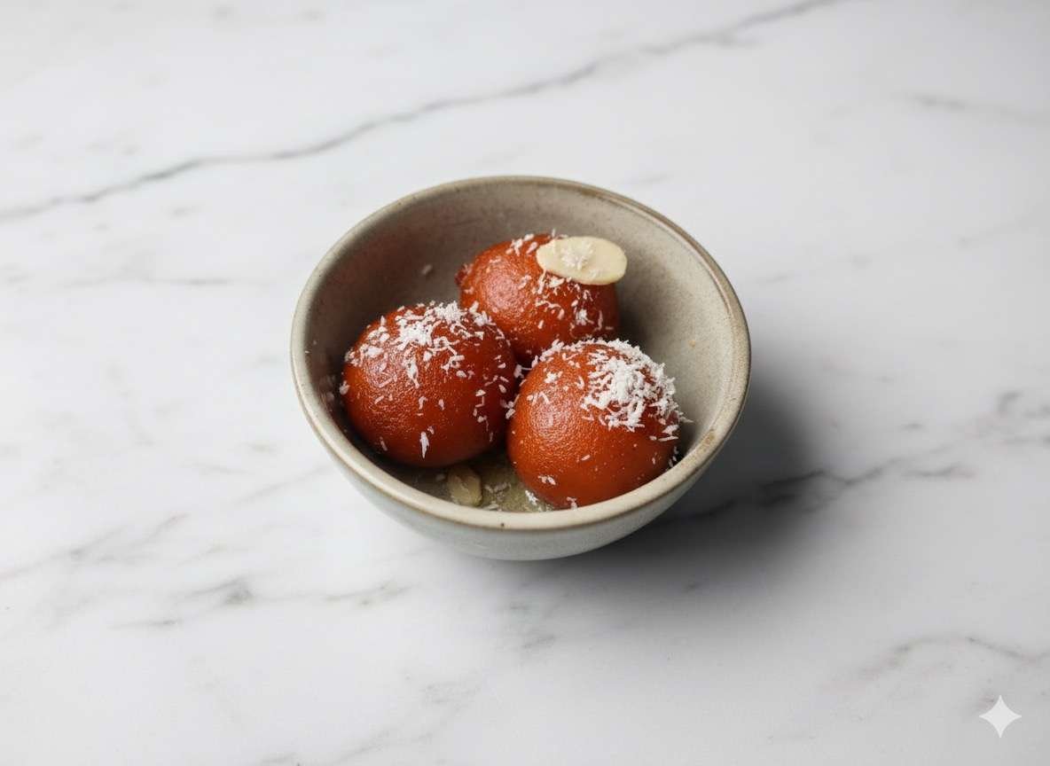 Frittierte Milchteigbällchen in Zucker - Sirup mit Mandelsplitter und Kokos