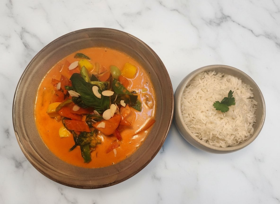 Garnelen in roter Thaicurry Soße mit Paprika, Bambus, Broccoli, Zitronengras und Kokosmilch