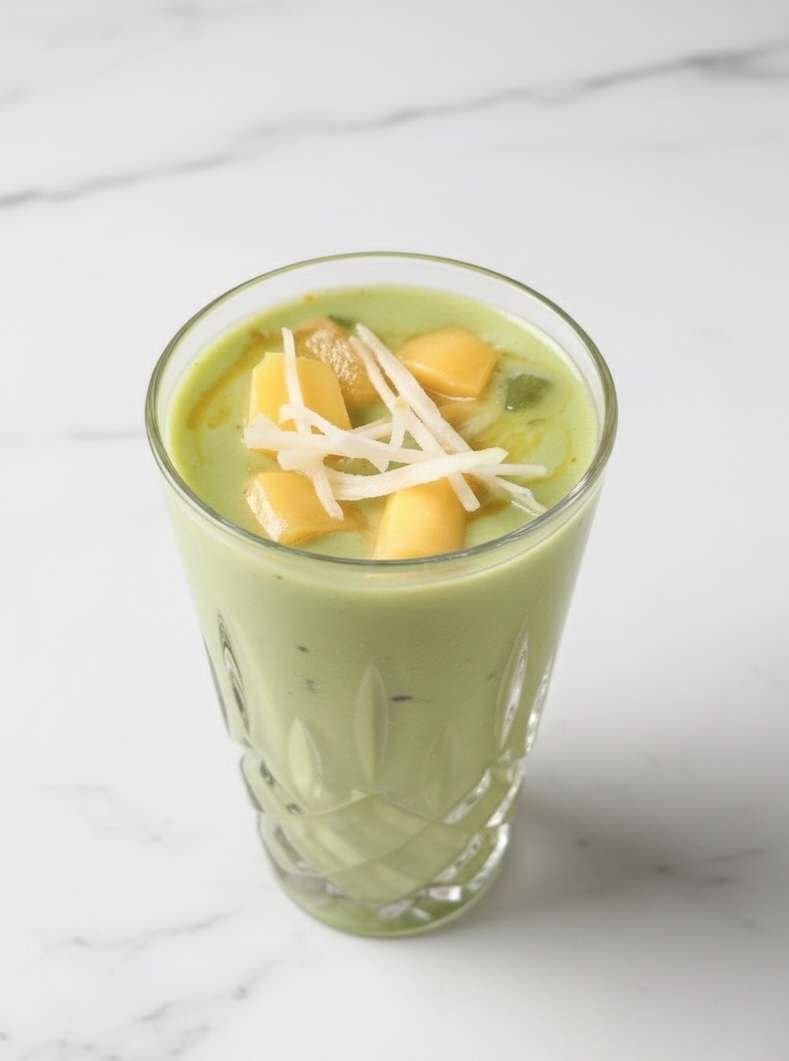 Exotischen Mangos mit Kokosmilch, Limettenblättern und Basilikum