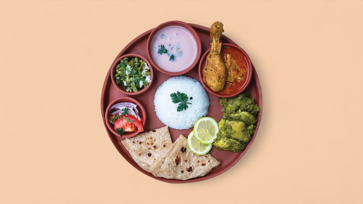 Zwei Spezialitäten des Tages, serviert mit 2 Chapatis, Bhaji, Reis, Salat und einer Süßigkeit
