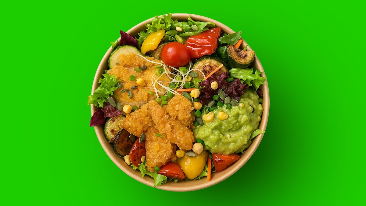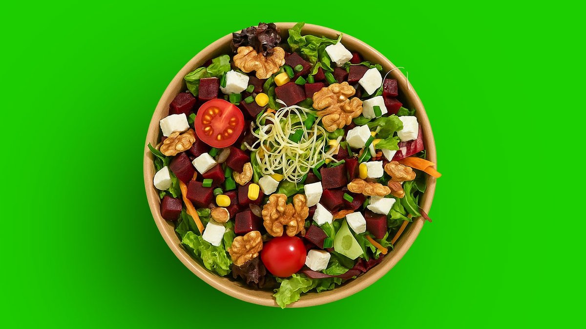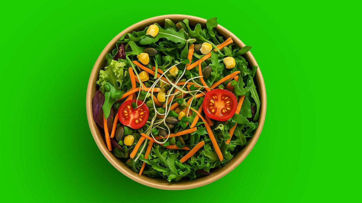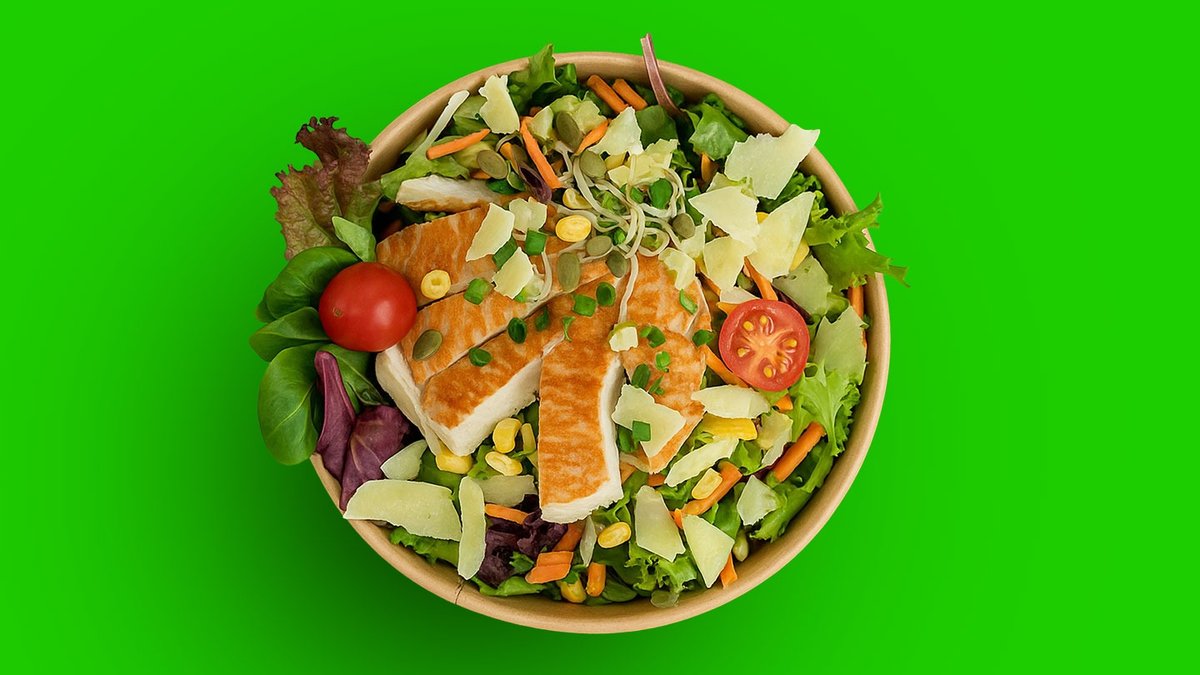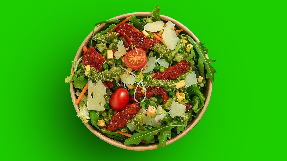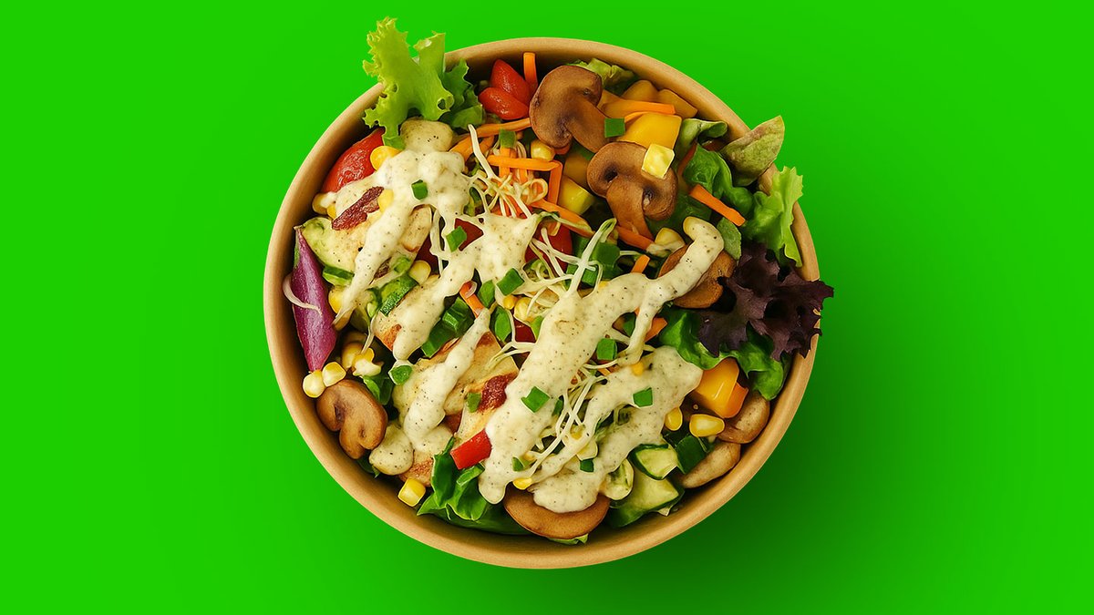 mit gemischtem Blattsalat, Kirschtomaten, Radieschen-Sprossen, Karotten, und Salatkernen