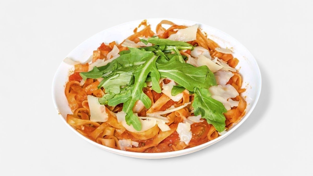 mit Tagliatelle, Zwiebeln, Kirschtomaten, Petersilie, Rucola und gehobeltem Parmesan