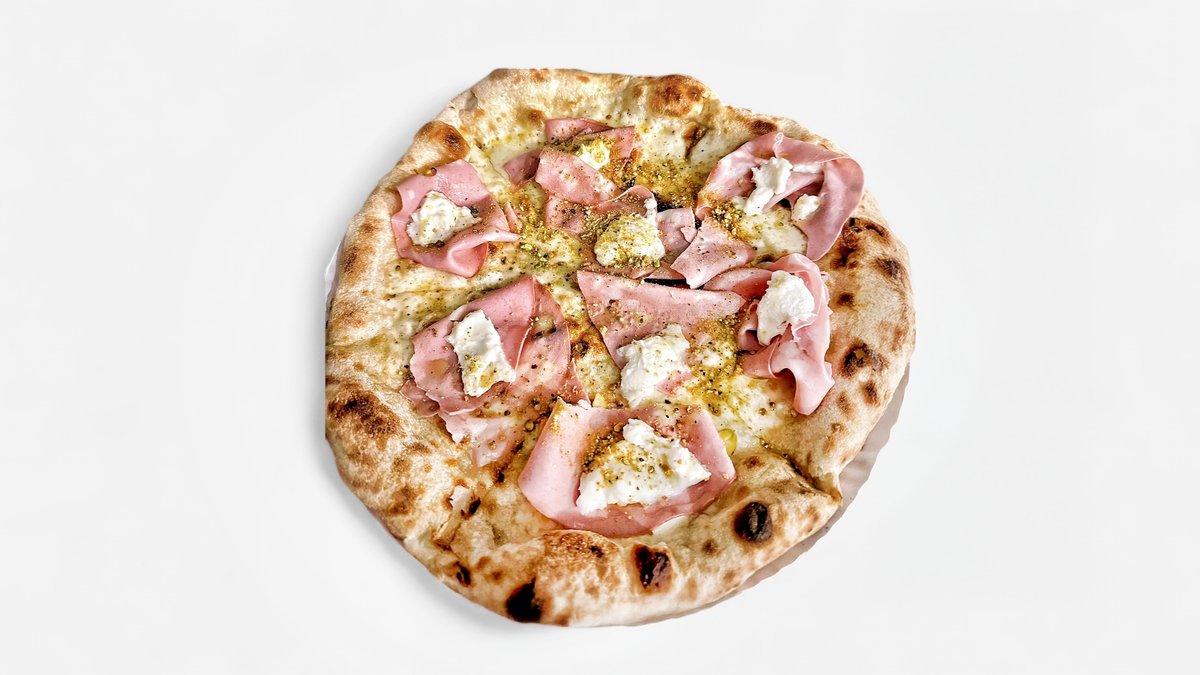 Mit fior di Latte , Mortadella, Pistazien,Buffelmozzarella und Parmesan