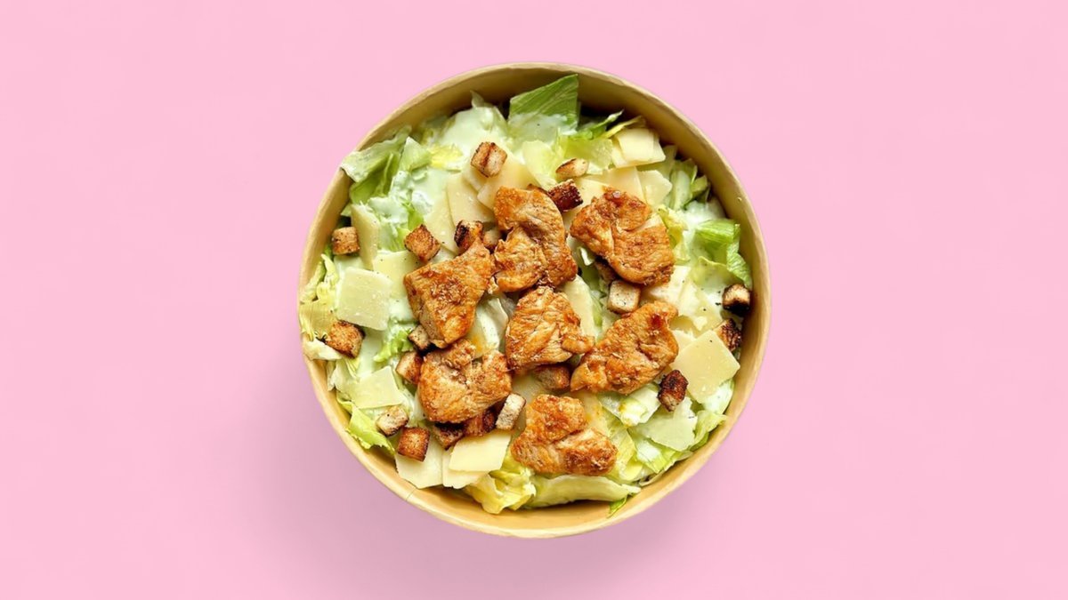 mit Eisbergsalat, Parmesan, Croutons, Hähnchenbrustfilet und hausgemachtem Dressing