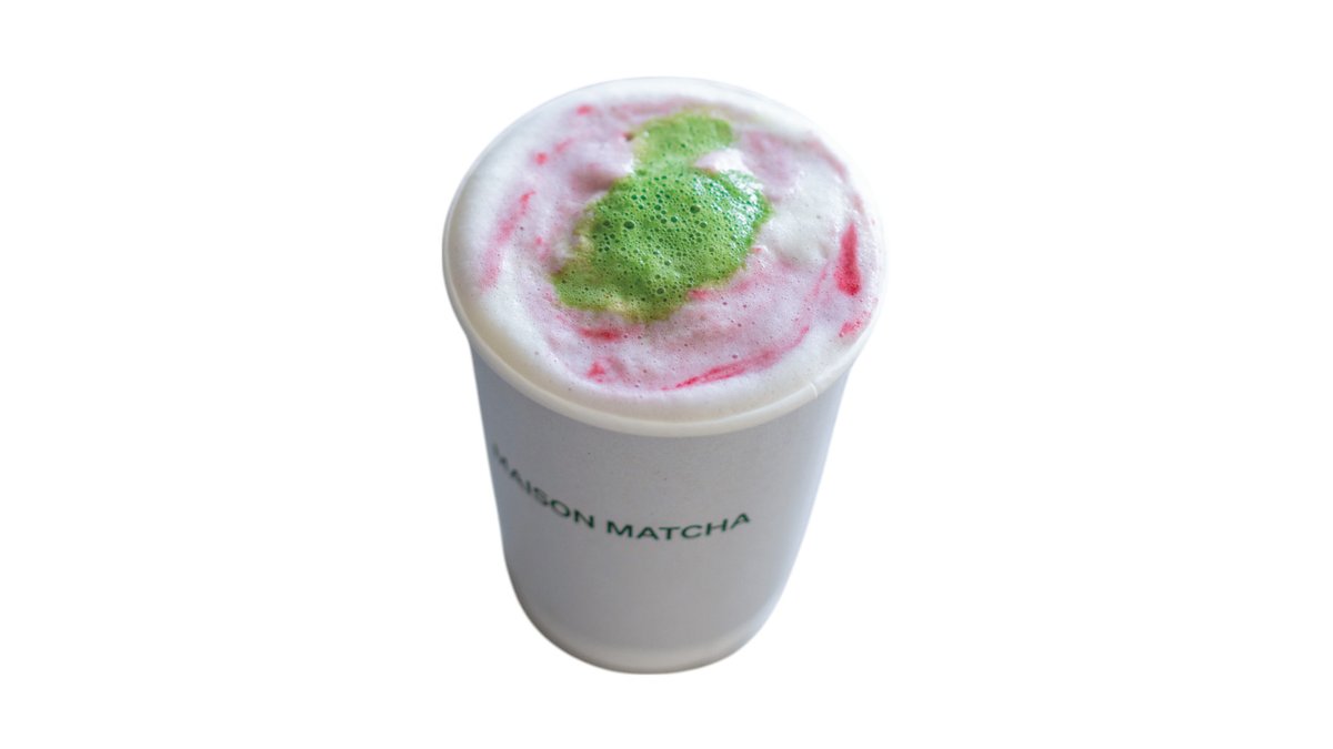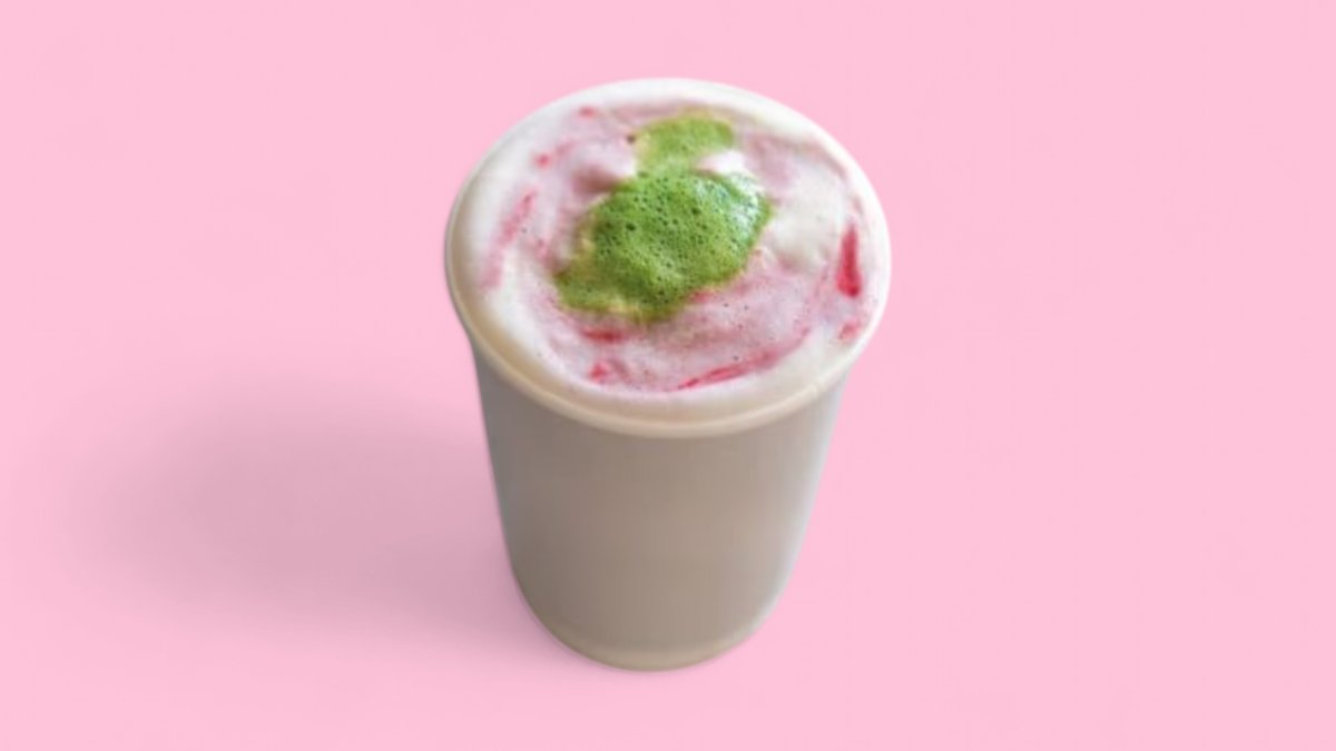 Ein gekühlter Matcha Latte mit dem süßen Geschmack von Erdbeeren.