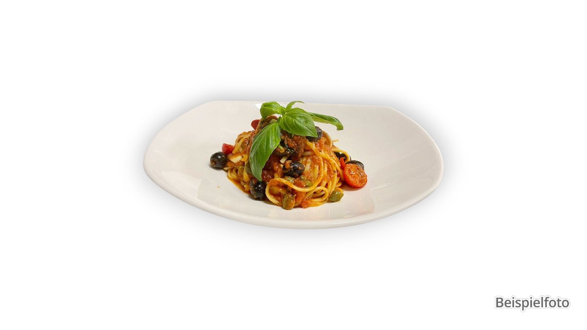 mit würziger Tomatensoße, Knoblauch, Kapern, Oliven und Oregano
