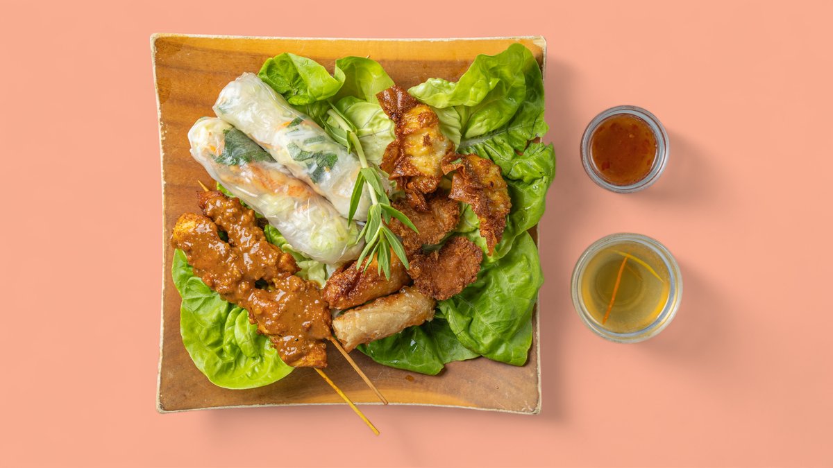 für 2 Personen, je 2 Stück Arrangement von fernöstlichen Spezialitäten Hähnchenspieße, Goi Cuon, Wan-Tan, Cha Gio, Butterflly Shrimps und erlesenen Dips