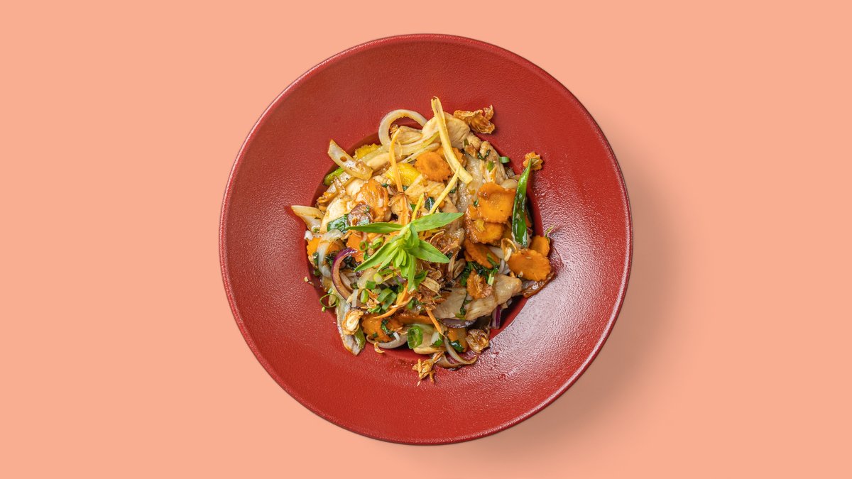 leicht scharf gebratene Reisnudel-Pfanne mit verlorenem Ei, Poulardenfleisch, Garnelen, frischem Gemüse der Saison, gestoßenen Erdnüssen und frischen Korianderblättern